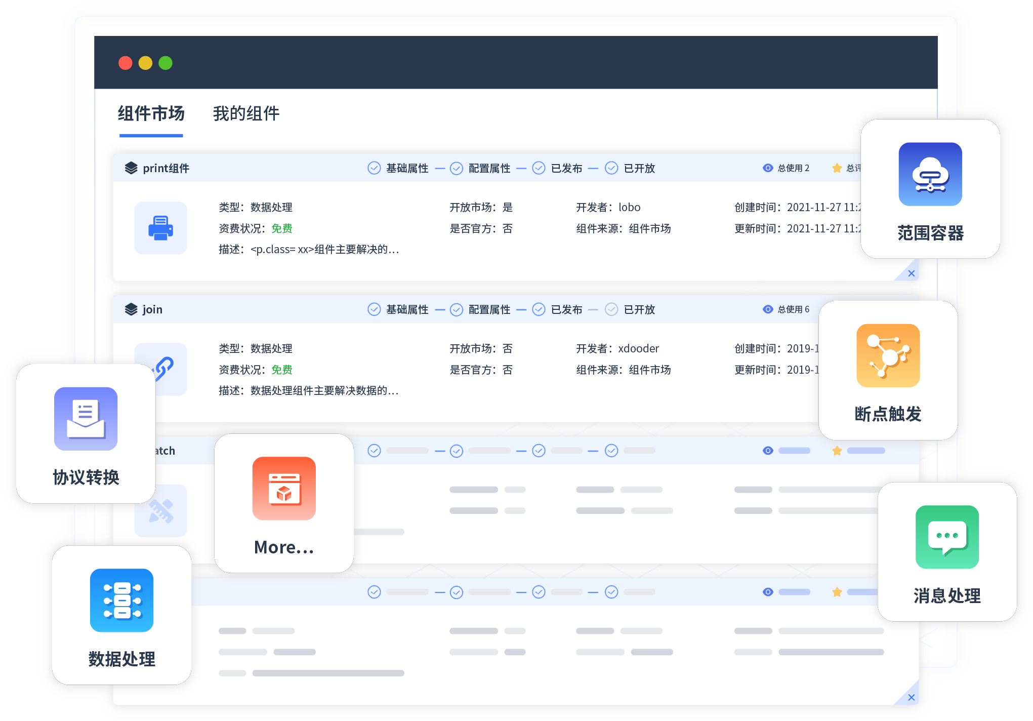 针对集成场景,,,ABPAY钱包提供组件市场,,,例如协议转换、、、消息处理、、、文件操作等。。。除平台提供的组件外,,,客户可以自定义所需组件。。。